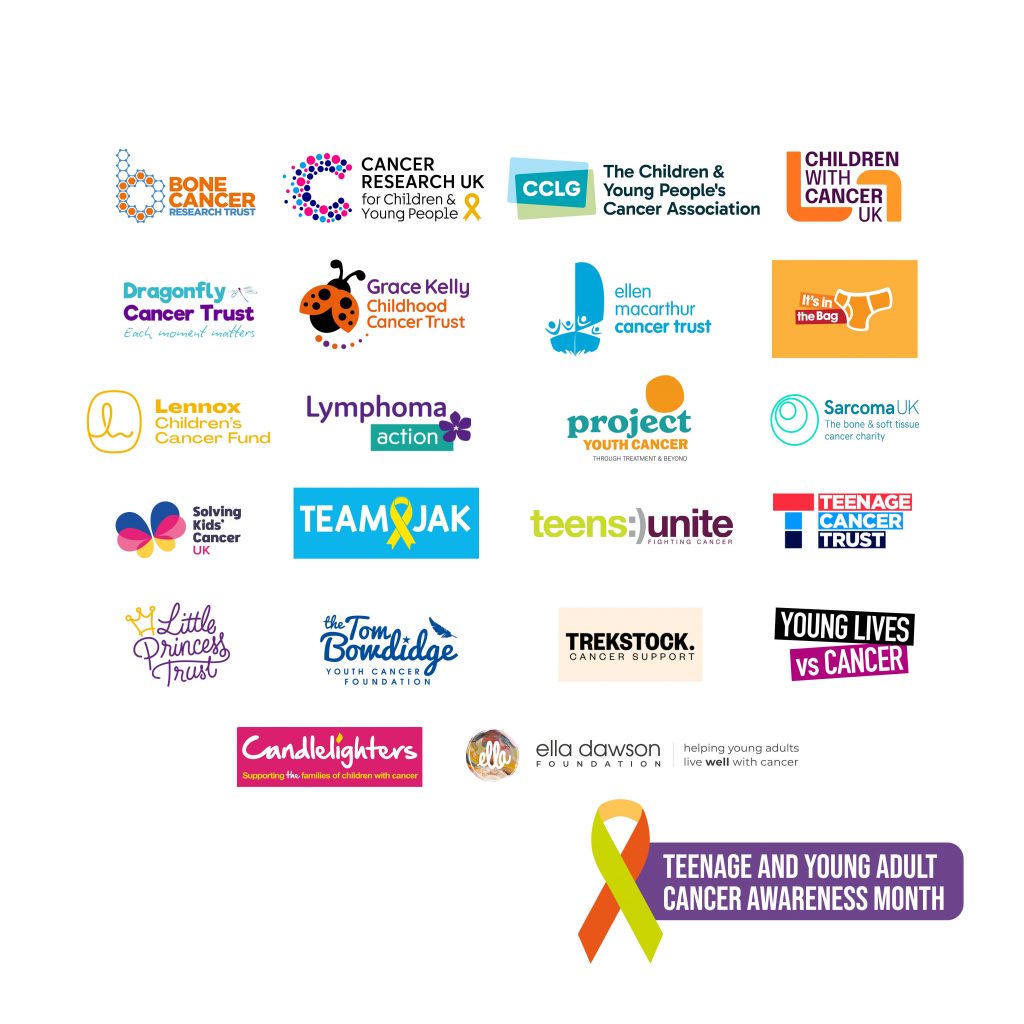 Research UK, Candlelighters, Children with Cancer UK, Dragonfly Cancer Trust, Ella Dawson Foundation, Ellen MacArthur Cancer Trust, Grace Kelly Cancer Trust, It’s in the Bag, Lennox Children’s Cancer Fund, Lymphoma Action, Project Youth Cancer, Sarcoma UK, Solving Kids Cancer, Team Jak Foundation, Teenage Cancer Trust, Teens Unite Fighting Cancer, the Little Princess Trust, the Tom Bowdidge Youth Cancer Foundation, Trekstock Cancer Support and Young Lives vs Cancer.